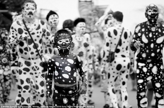 ![]() 4/18阿克兰卡利博菲律宾摄影师Manex Sungahid摄于阿提阿提汗节当天。图中的小男孩全身画着黑白相间的斑点图案,正好和镜头对视。
