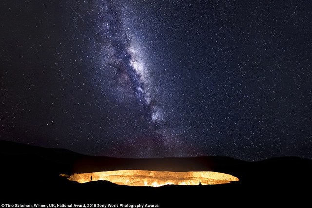 ![]() 10/18英国摄影师Tino Solomon 拍摄了两名探险家走在土库曼斯坦“地狱之门”的惊人场景。