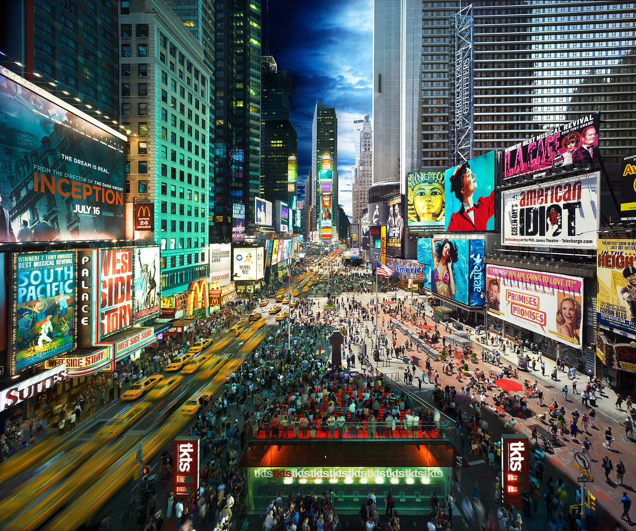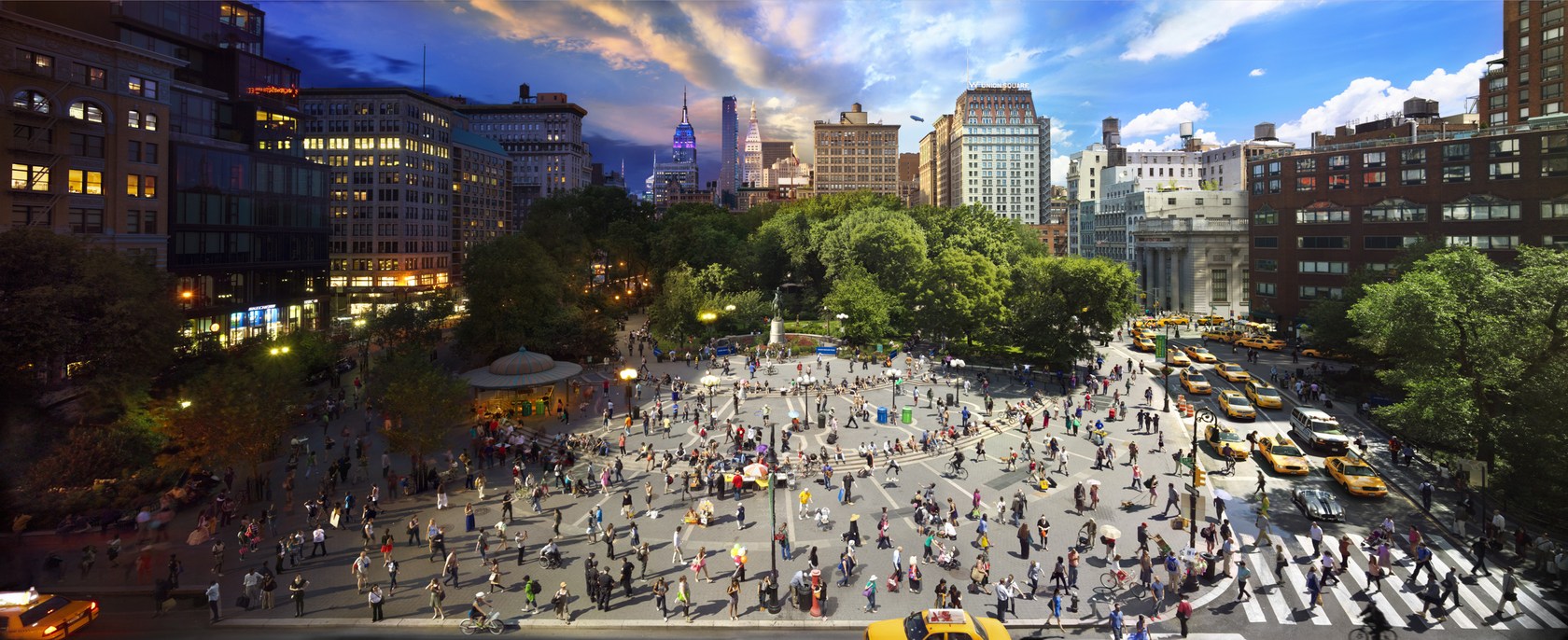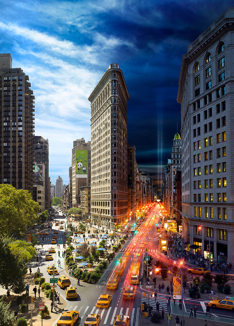 Stephen Wilkes花费数十小时拍摄纽约城的上百张图片,通过后期制作,组成一系列从白天到夜晚变化融合在同一张图片上的作品,画面明暗变化柔和,充满超现实风格。