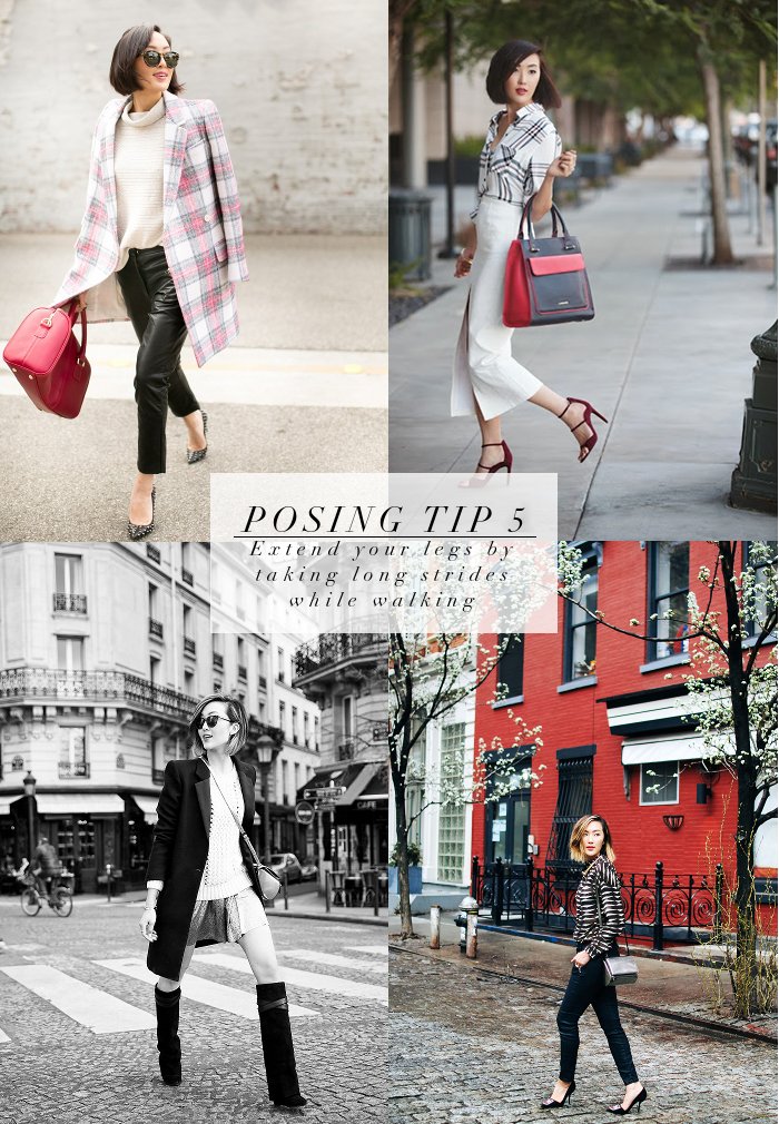 时尚杂志或街拍中经常出现模特儿及街拍客老是一副走路匆匆的样子,你以为他们真的有什么事这么忙碌吗?当然不是的,那是因为这样跨步走路的样子能让他们身体延伸、看起来更高更瘦。快学起来!以后拍照时也让妹子这样有事没事走路一下吧。