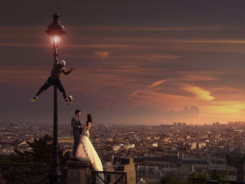 这是巴黎北部的蒙马特高地,从这里能俯视整个巴黎城区。当时著名花式足球艺人Iya Traoré正在进行表演,我觉得特别有趣,想要让他出现在我的画面里。出于尊重,我事先取得了本人的许可,提前征求同意也能让对方更配合,以便在最短的时间里完成理想的动作,达成最佳画面效果。