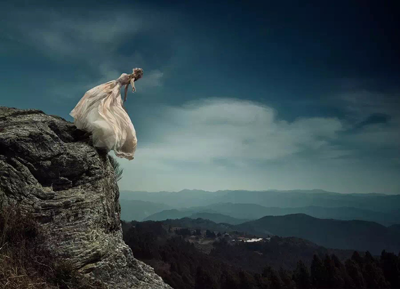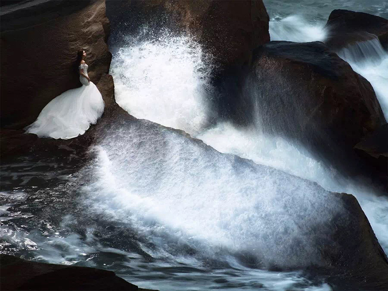 这是在日本北海道的活火山拍摄的,傍晚纯自然光条件,且当时风很大,吹动着头纱飞起来的样子美极了。日落前的光线极具戏剧色彩,用闪光灯补光有时候反而显得生硬和多余,此时人物姿态上只要迎合自然光的光位即可达到完美效果。