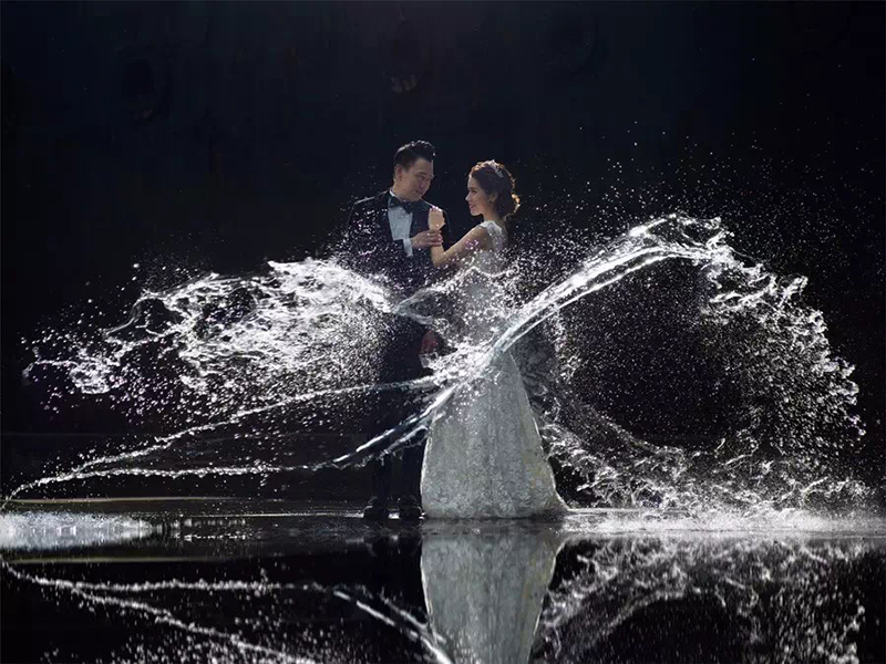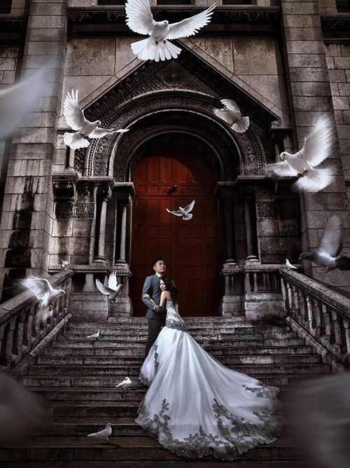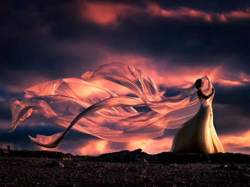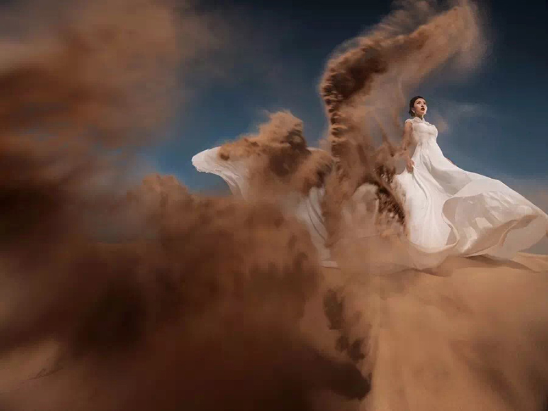轻薄柔软的纱、绸缎等材料做成的婚纱、头纱以及其他造型元素,很适合在相对简单、空旷的环境中飘动“飞舞”,这时会令原本单调无奇的画面呈现出一种柔美而磅礴的气势。