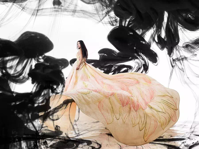我想要创作出一种画面,将人物融在中国水墨的感觉中,但又不失摄影画面的立体感。于是我突出了水墨的层次,使其穿梭在人物周围,强化透视和层次感。拍摄前已经想好后期合成墨水,从后往前的包围式光线最能表现墨融于水后的纹路和线条感,所以前期拍摄人物时必须迎合墨水素材的光效。