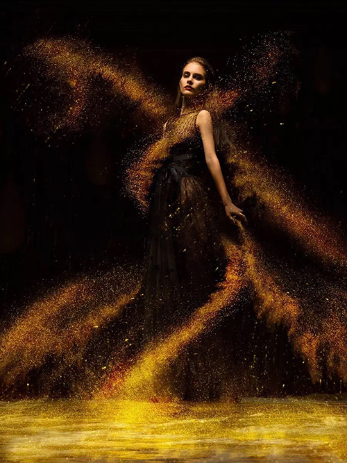 3.人物后方和胸前部分的金沙,为素材合成。旁边的助理负责甩金沙,多拍几次,直到能选出合适的素材。