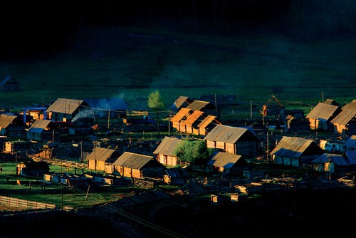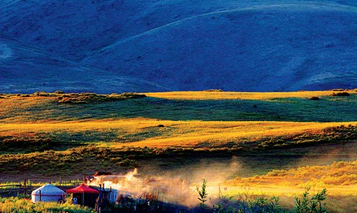 这张草原晨曦的照片中,阳光从侧面照射到原野上,勾勒出无数黄绿色的线条,使画面生动、活跃,同时表现了袅袅的炊烟。