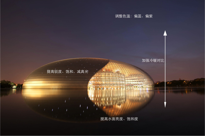 天空变成了蓝紫色,更梦幻了。但天空过亮,过于抢主体,需要压暗一些。