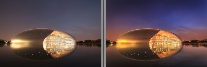 可以看到建筑内灯光的高光部分没有那么亮了,细节更明显了,水里的阴影也更亮了。但画面显得更灰了,对比更低了。