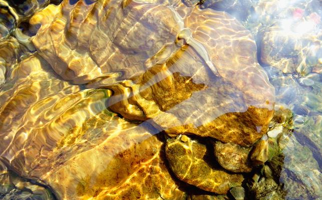 ▲溪流浅浅的流水,水流反射在石头上的光影