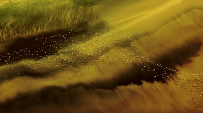 - 简介︰摄于非洲大裂谷的Lake Turkana,一群红鹤正飞越上空。
