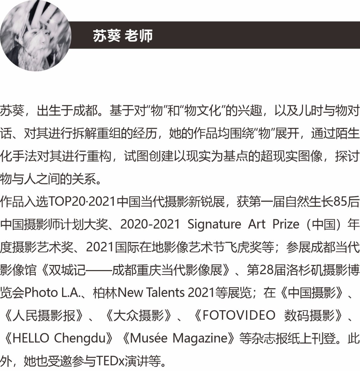 “物”与“技术”是我作品的重要组成部分。前者涉及创作对象,后者涉及创作方式。《摄影:物与技术》一课将以自我创作经历为基点,围绕“物”和“技术”这两个关键词展开,从创作对象与创作方式这两个角度探讨摄影实践的一些重要问题,拓宽既有的摄影认知。