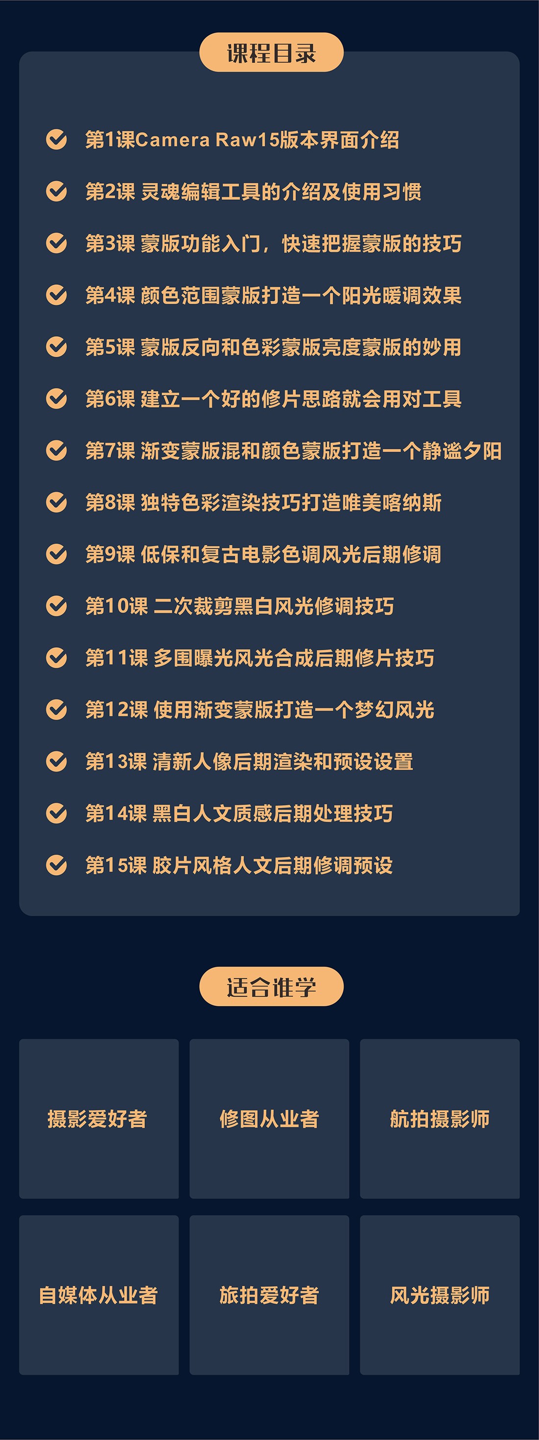 Camera Raw15版本的升级带来了一些颠覆性的功能,为RAW格式照片直出提供了保障,蒙版功能升级也极大的提高了工作效率,是摄影师和后期修图工作者必备修图利器,本系列课程从入门到进深全面掌握编辑及蒙版的高级应用技巧(15节课程)更新中...