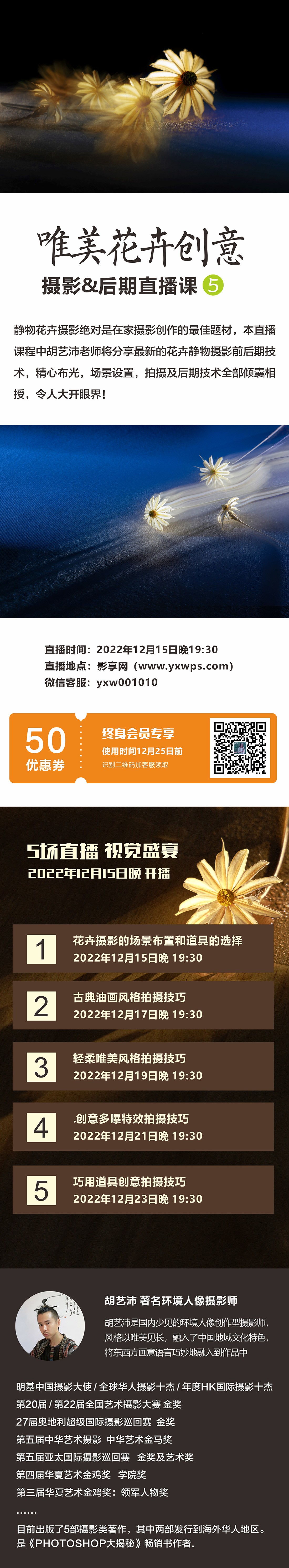 静物花卉摄影绝对是在家摄影创作的最佳题材,本直播课程中胡艺沛老师将分享最新的花卉静物摄影前后期技术,精心布光,场景设置,拍摄及后期技术全部倾囊相授,令人大开眼界!