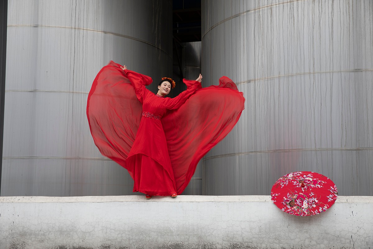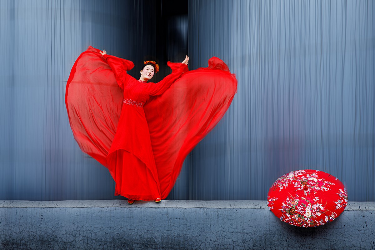 适当裁剪画面,恢复画面的光影层次,增强对比度,调整红色信息的饱和度和明亮度,制作背景动感虚化效果,让人像更加出彩
