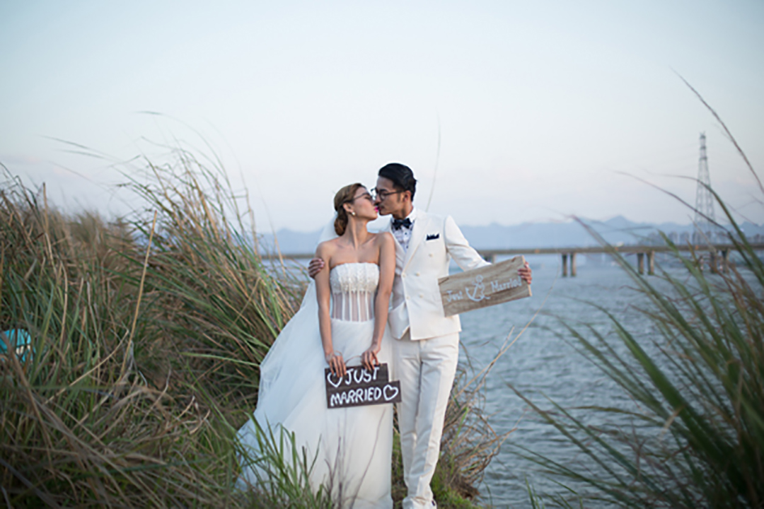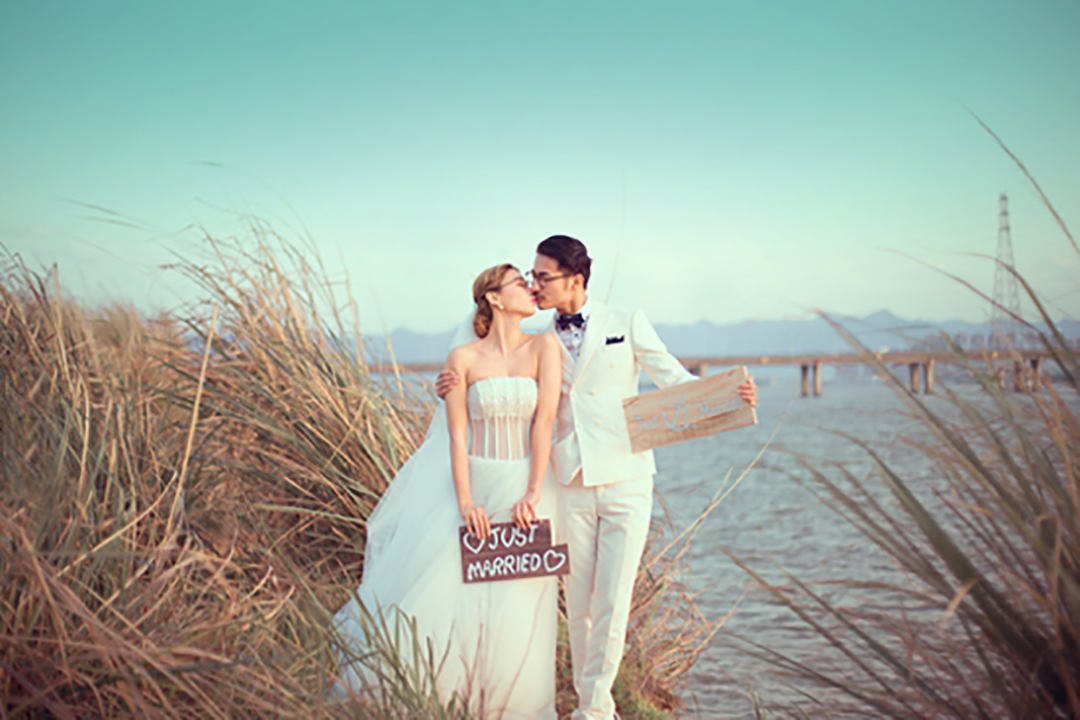这是一张婚纱照,拍摄的风格比较韩式。韩系的风格,都比较清爽淡雅,色彩不会太浓,所以后期处理的色彩,也要跟人物的服装和道具相互协调。