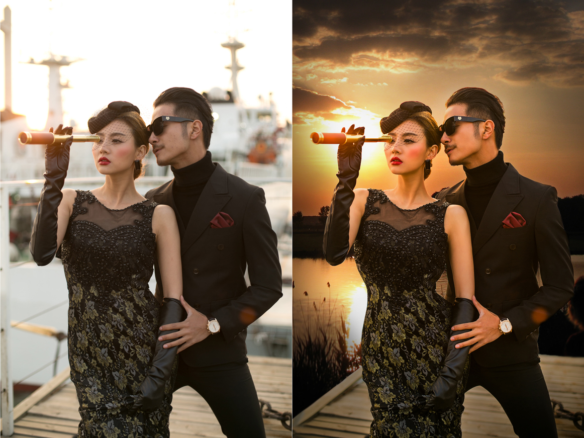 这是一张晚礼服的婚纱照,人物的肢体非常到位,但是背景稍微有点杂乱,根据这个特点,尽量把人物的背景处理的干净空旷些,人物的服装也比较厚重,所以我们也要把色调尽量调的厚重些。