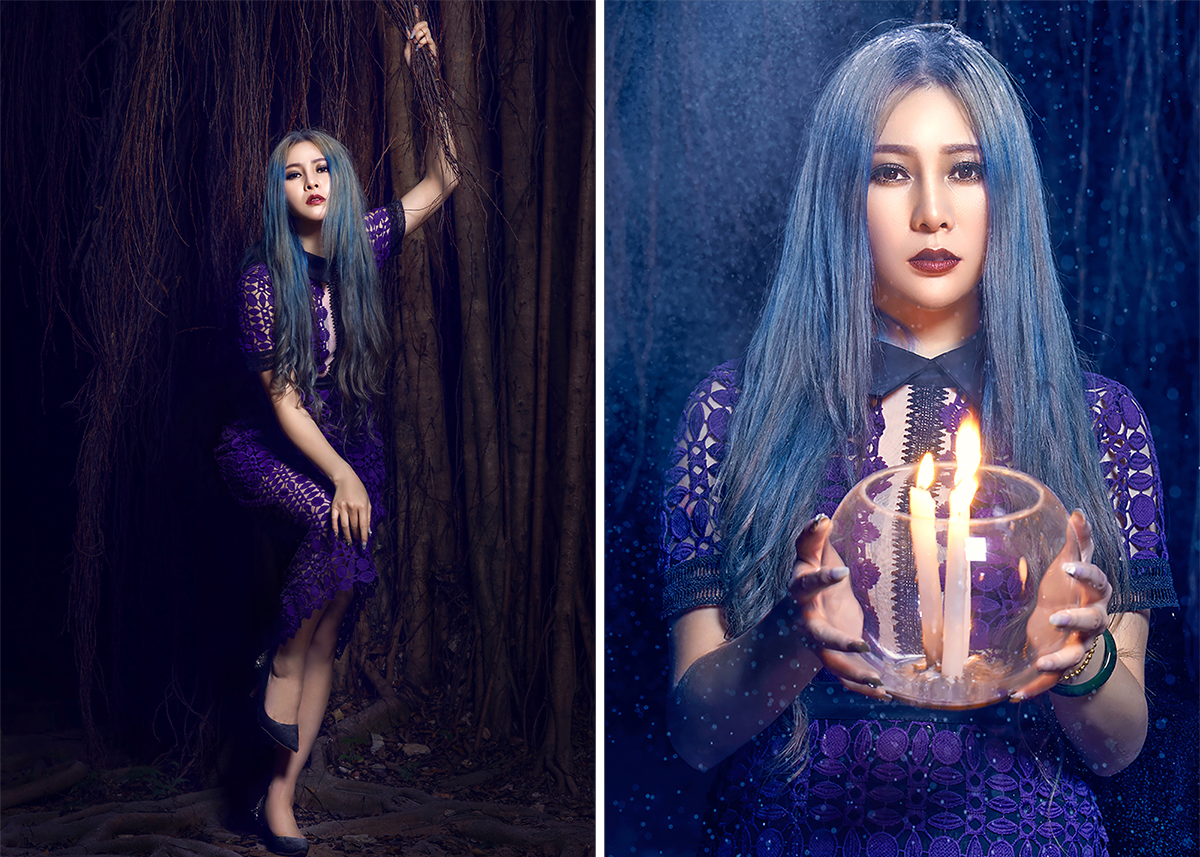 本次创作灵感来源于季节变化,春暖花开,除了满山遍野的鲜化以外,映入眼帘的便是一片片绿色了。为了突出主题在色彩上的鲜明对比,本次创作的服装选择的是紫色。紫色与绿色形成的冷暖对比,使得主题更加跳跃突出。