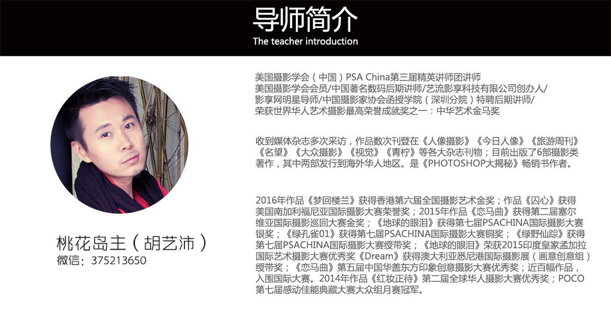 创意人体摄影是一种新奇的艺术摄影,是身体与世俗间的一场格斗,也是观念的创新与传统意识间的一场挑战。胡老师用他的作品来给我们带来陌生的感知和奇妙的想象,带领我们一同探秘隐藏在人体里的其妙幻想与艺术灵魂。