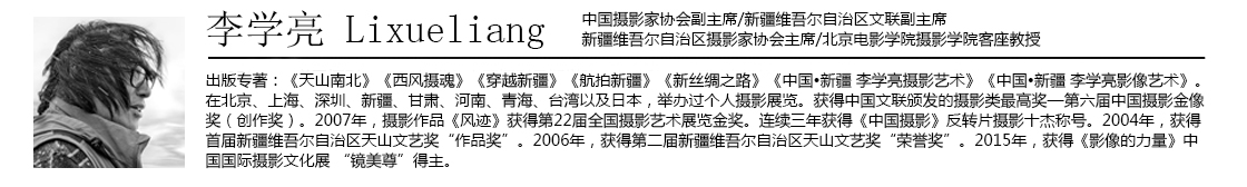 李学亮是新疆本土成长起来的中国风光摄影领军人物,在职业生涯摄影工作中,独自驾车游遍天山南北,曾5次攀登博格达峰,7次穿越罗布泊,10余次走进塔克拉玛干大沙漠,行程60余万公里,拍摄照片5万余幅,是完整反映新疆的第一人。