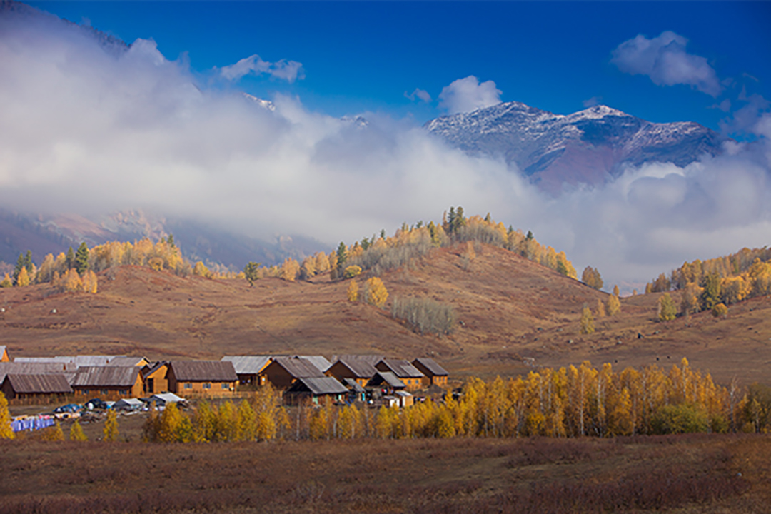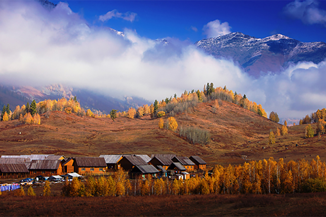 新疆的秋天景色,颜色大多以绚丽浓艳为主,金黄色的树林和蔚蓝的天空,相互辉映,强烈的色彩对比,让画面犹如油画般充满诗情画意。原图的画质比较灰,整体色彩不够跳跃。