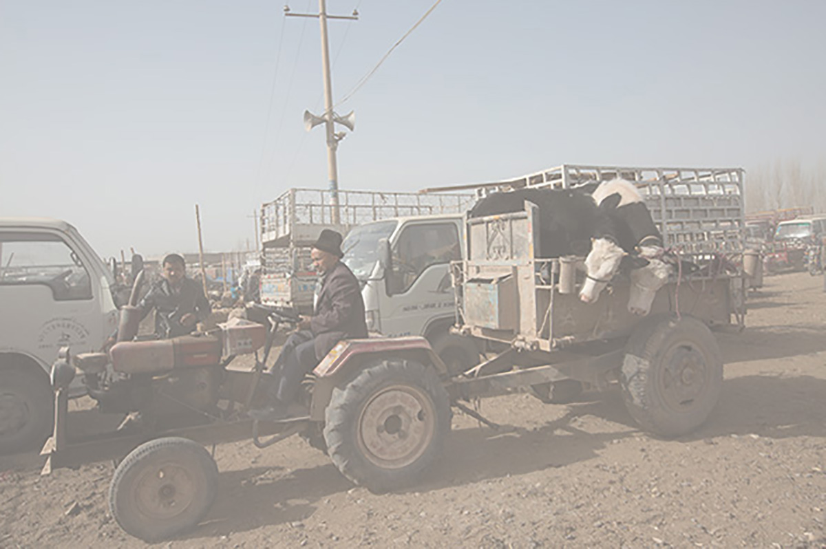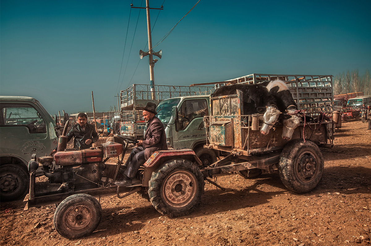 这节课来教大家一种人文片的处理方法,这幅作品是在新疆的一个小集市抓拍的一个画面。描述的是一个老大爷开着农用车准备去交易他的牲畜。这样的画面非常自然和真实。但是因为太过于真实跟从容再加上这幅照片的原片灰蒙蒙的,所以无论从色彩还是其他方面,看不出来有什么亮点跟特色。那么像这种片子怎么去处理呢?所以在处理之前,我们要去分析这个画面的一些状态,怎么去挖掘画面的亮点,围绕这个亮点去后期处理,我们看到这个画面远处有电线杆,电线,人跟车,还有近处的这些农用车。这些内容非常的杂乱,很没头绪。反而这些状态恰恰是这个画面的一个亮点。我们可以围绕这些杂乱跟结构来进行后期的处理,通过后期把这种质感表现出来,再通过色彩的渲染和对比把整个画面的杂乱感表现出来。
