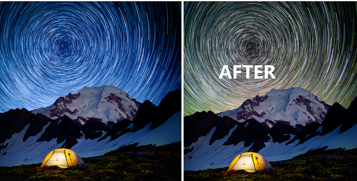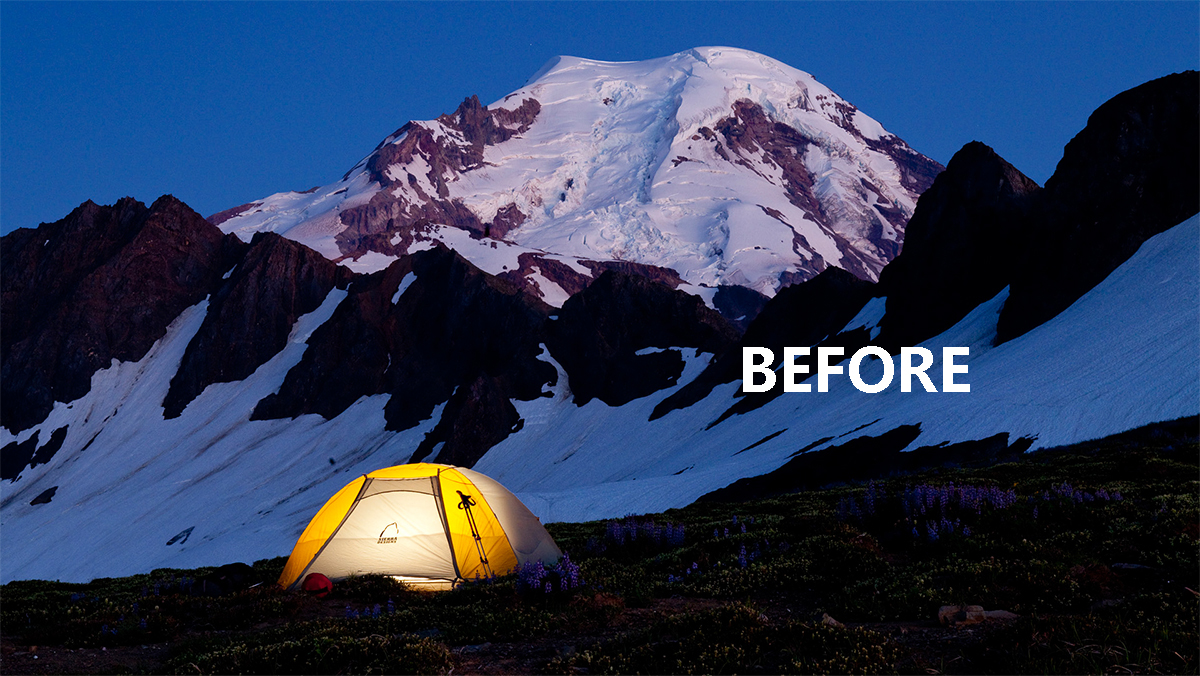 今天我们来分享个案例,在我们出去深度旅行或者野外探险的时候会经常遇到的帐篷生活,我们一定要抓住这个时间找个合适的角度和位置拍照。原片的天空面积非常小,处理后的图片的天空面积很大,还加了星轨的效果,非常酷炫。