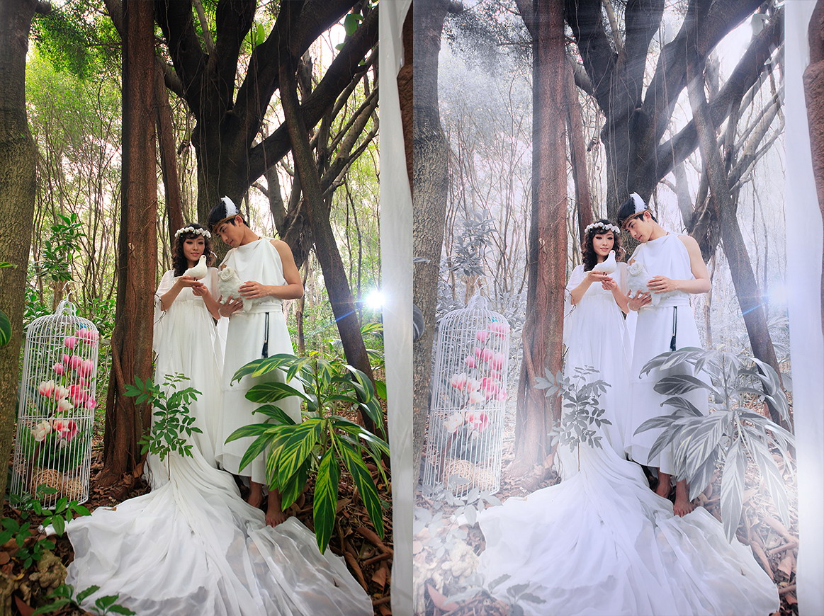 这是一种超现实的色彩,它给人的感觉比较安静和神秘。原图的色彩比较艳丽,跟人物素雅的服装不太协调,所以为了营造环境,渲染氛围,我们通过后期一些常用的工具,来调整图像。