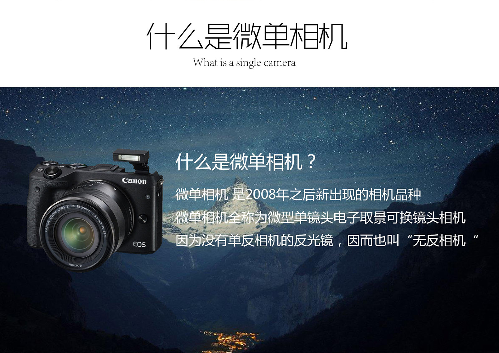 什么是微单相机呢?“微单相机”是2008年之后新出现的相机品种,实现了相机的轻薄化、小型化。第一个使用微单相机名称的就是索尼。微单相机全称为微型单镜头电子取景可换镜头相机,因为没有单反相机的反光镜,因而也叫“无反相机”。