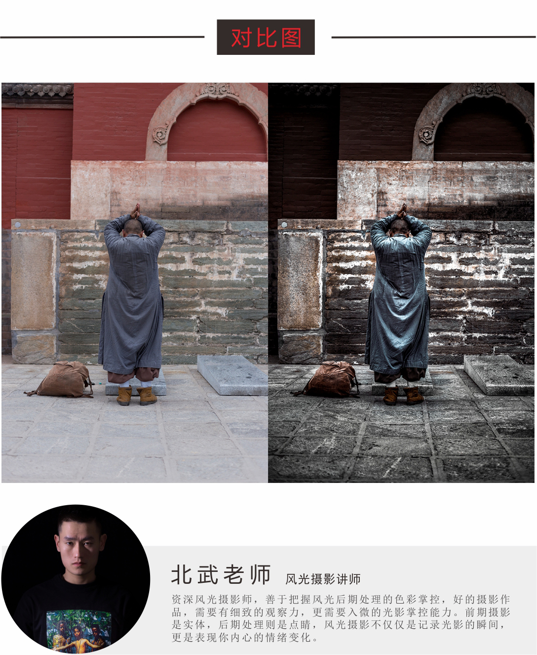 这是北武老师在武台山拍摄的一个人文片《虔诚之心》,很多远方僧人都会来此修行。图中僧人在四院门口朝拜了一个多小时,这里采用的拍摄方法是定焦大光圈从主体的正后方手持拍摄,一是减少杂乱,二是突出僧人的虔诚,但是红色背景似乎抢了僧人的光环,为了更好的突出人物,下面北武老师的寺院人文后期的处理方法希望能给到你们一些帮助。