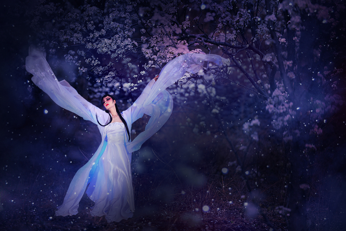 这是根据电影《霸王别姬》,有感而发,做出的创意合成效果。它是模仿电影的光影效果。在前期拍摄时,灯光上用了一些蓝色的色片,来营造阴郁悲伤的氛围。在素材选择上,用了一副开满白色梨花的图片,当做背景,是为了和主题相互协调。画面中加入雪花的素材,主要是烘托氛围,让画面的意境,更加深入。