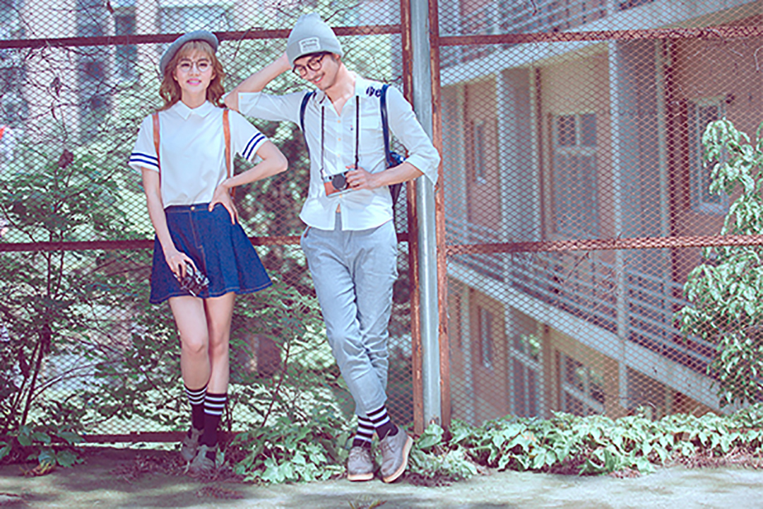 这是婚纱照里的特色服装,人物的装扮比较文艺,色彩略微带点青色,整体风格聚青色淡蓝色为主,人物的肤色比较白皙,所以我们要对它进行调整,使这张婚纱照显得有文艺的色调。