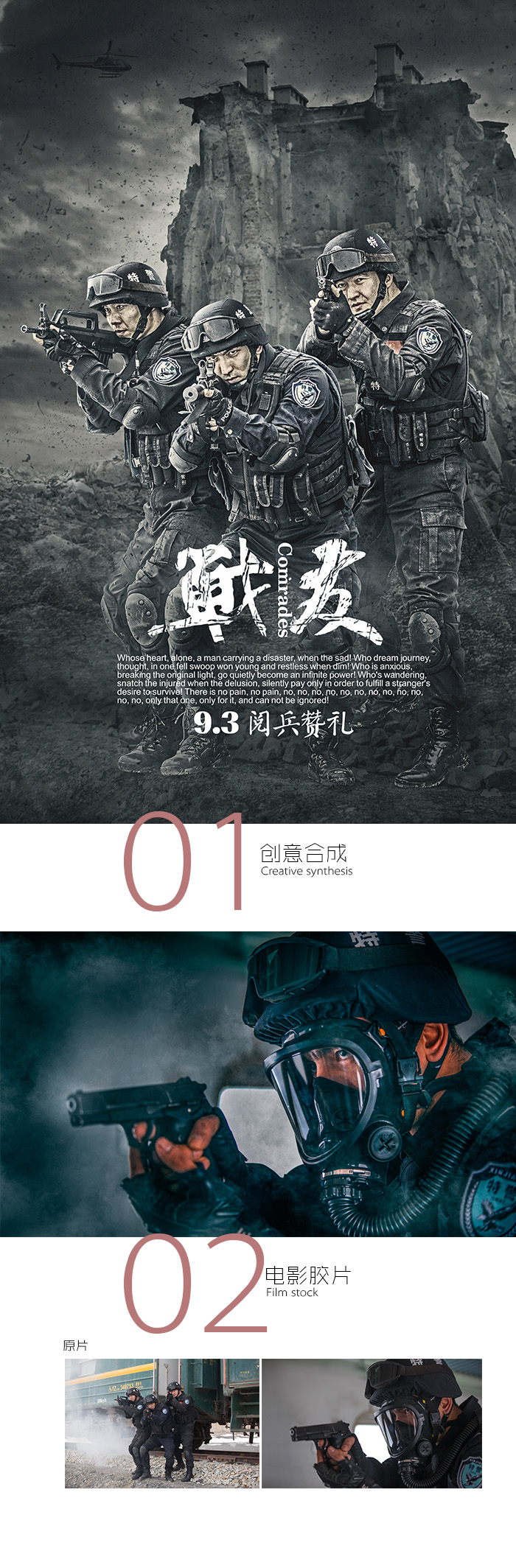为纪念反法西斯抗战胜利70周年,本专题通过合成创意及调色处理,再现军人英勇气质,本专题细致讲解了合成思路,处理方法。