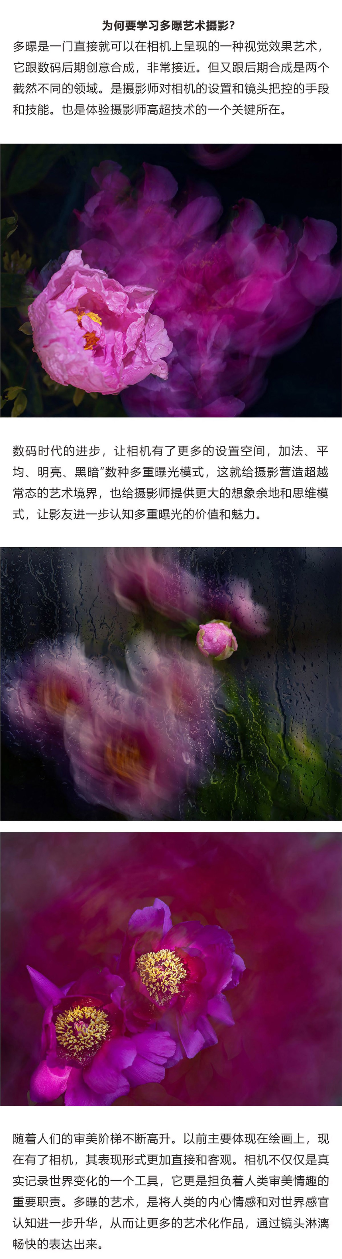 直播目录《多重曝光艺术摄影直播课》是由著名环境人像摄影师,影享客艺术总监胡艺沛老师特别推出的高端多重曝直播研修班,独创的拍摄技巧,奇妙的创作思路,简易的授课方式,让每位参与的影友所见所得,快速上手,轻而易举的拍出精彩绝伦的多重曝光创意作品。